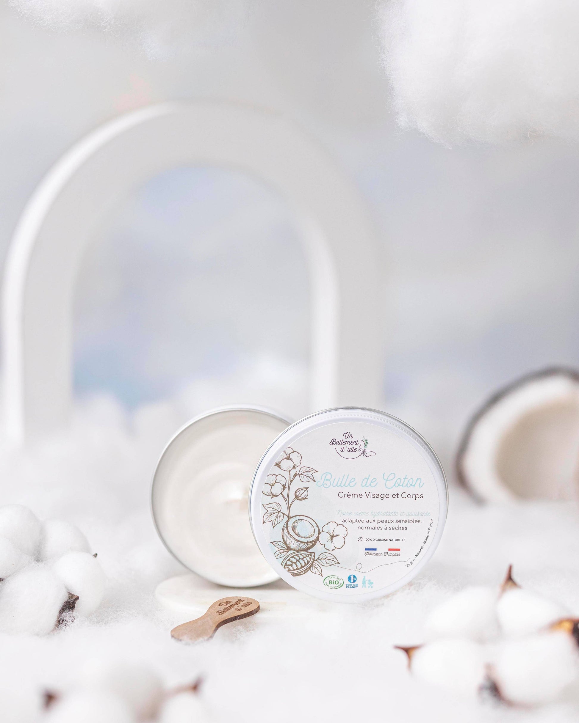 Fidèle aux valeurs d’Un Battement d’aile, Bulle de Coton est conditionnée dans un pot en aluminium recyclé et recyclable, léger et réutilisable. Fabriquée en France, elle soutient une démarche locale et minimise l’impact carbone de sa production.